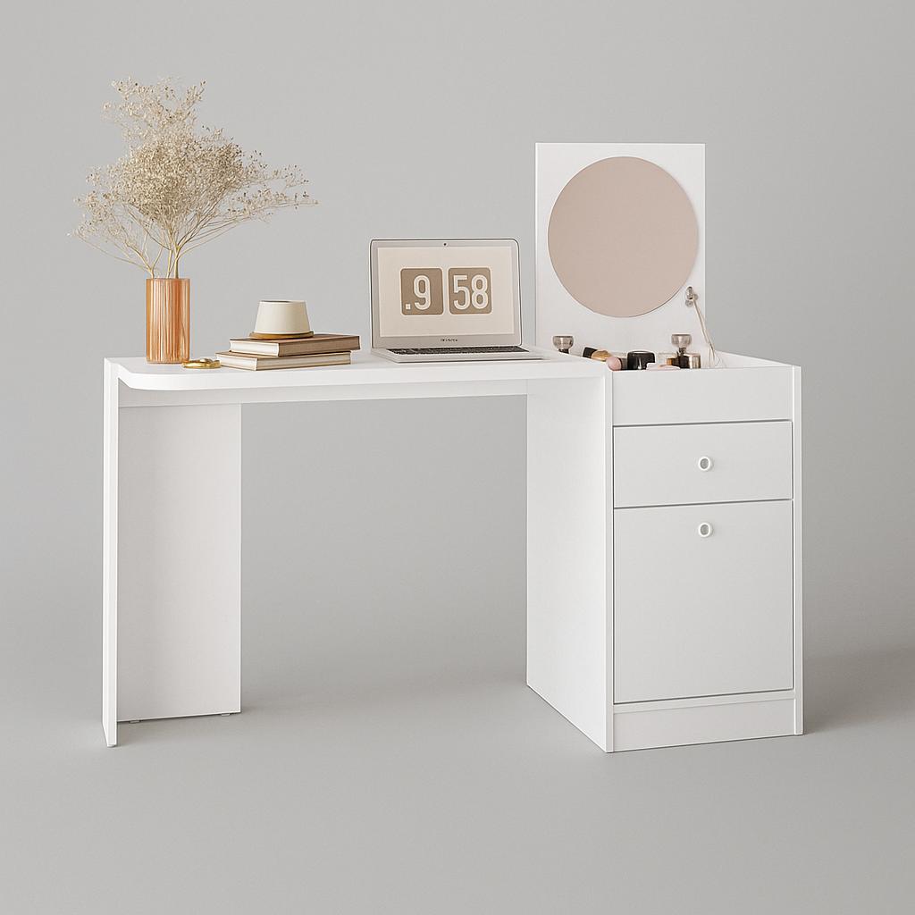 This sleek and modern white dressing table combines elegance with practicality. Designed for versatility, it features a spacious tabletop perfect for work or makeup sessions, a flip-top vanity section with a built-in round mirror, and organized compartments for cosmetics and accessories. The unit includes a smooth-glide drawer and opening door ideal for storing shoes, handbags, or decor. Whether you’re getting ready for the day or working from home, this all-in-one table adds both style and function to your space.